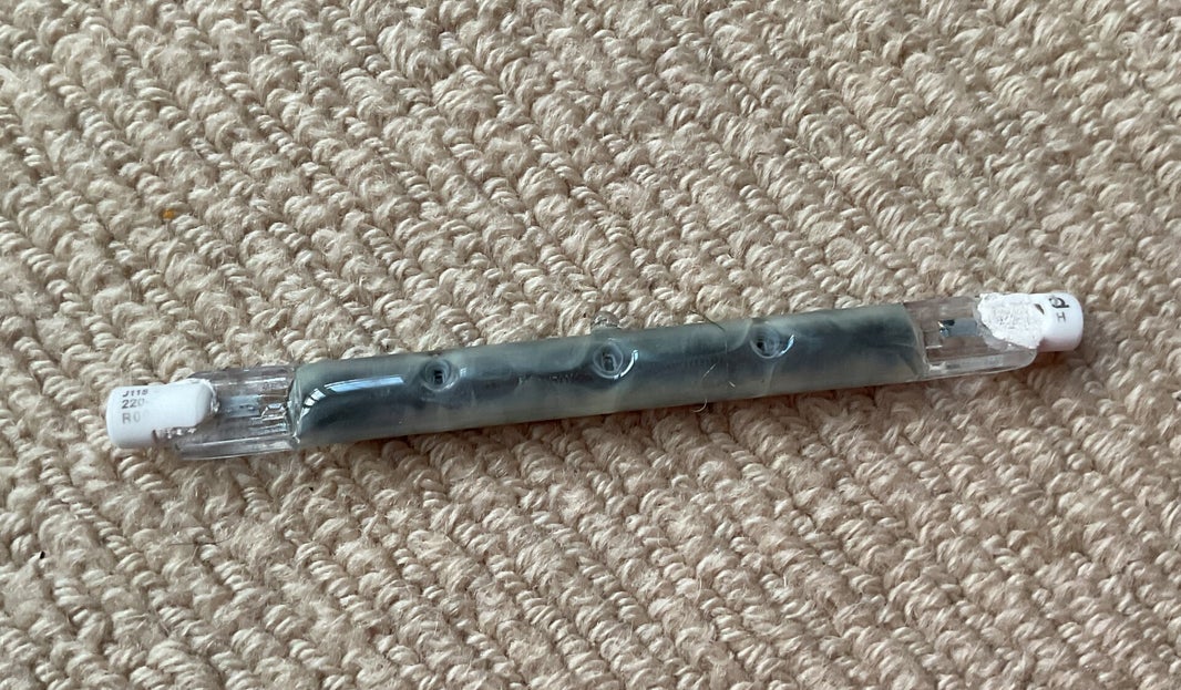 This is the 400w halogen lamp that came in the 400w halogen floodlight that I found in a skip in Bracknell. As you can see, the lamp is completely cooked and burnt out.