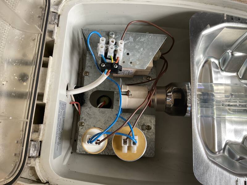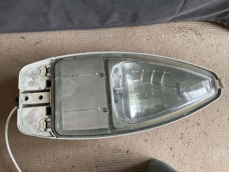 This is my CU phosco p567. It runs on 35w Sox and is made from GRP (fibreglass). It also has a 2-part photocell which is disconnected but still attached. It also has a polycarbonate bowl on it and has part of a bracket still left inside the spigot.