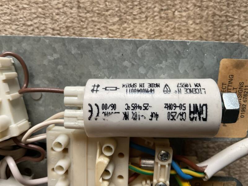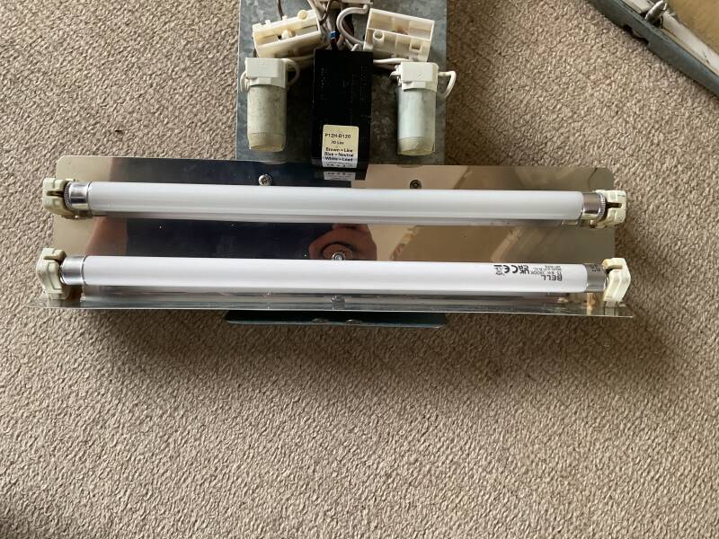Here is inside the lantern, you can see the osram st111 starters, the fuse holders, the Royce-Thompson Mini-photocell, the capacitor and the bell and crompton 8w fluorescent tubes.