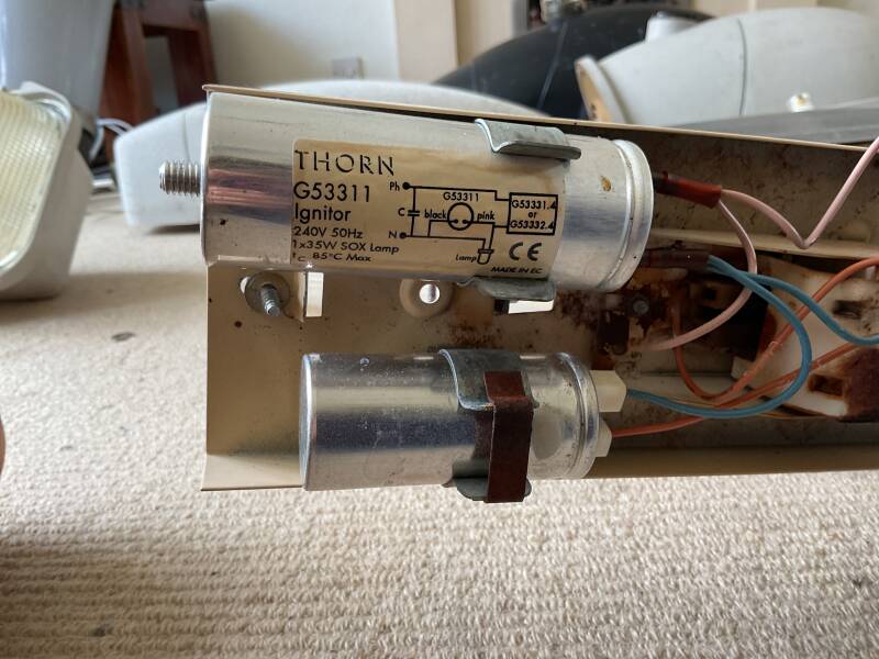 This is my Thorn Beta 5 top-entry street light. It has got a very old REVO bracket on top of it and has a plastic clip on it instead of the older metal ones. It runs on a 35w SOX lamp.