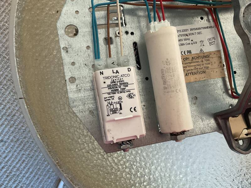 This is my WRTL 2015. It has a Tridonic ballast and ignitor, and it runs on a 70w SON-T lamp. It was made in 2005 and has a GRP canopy and a polycarbonate bowl.