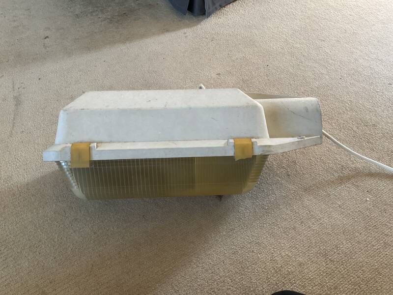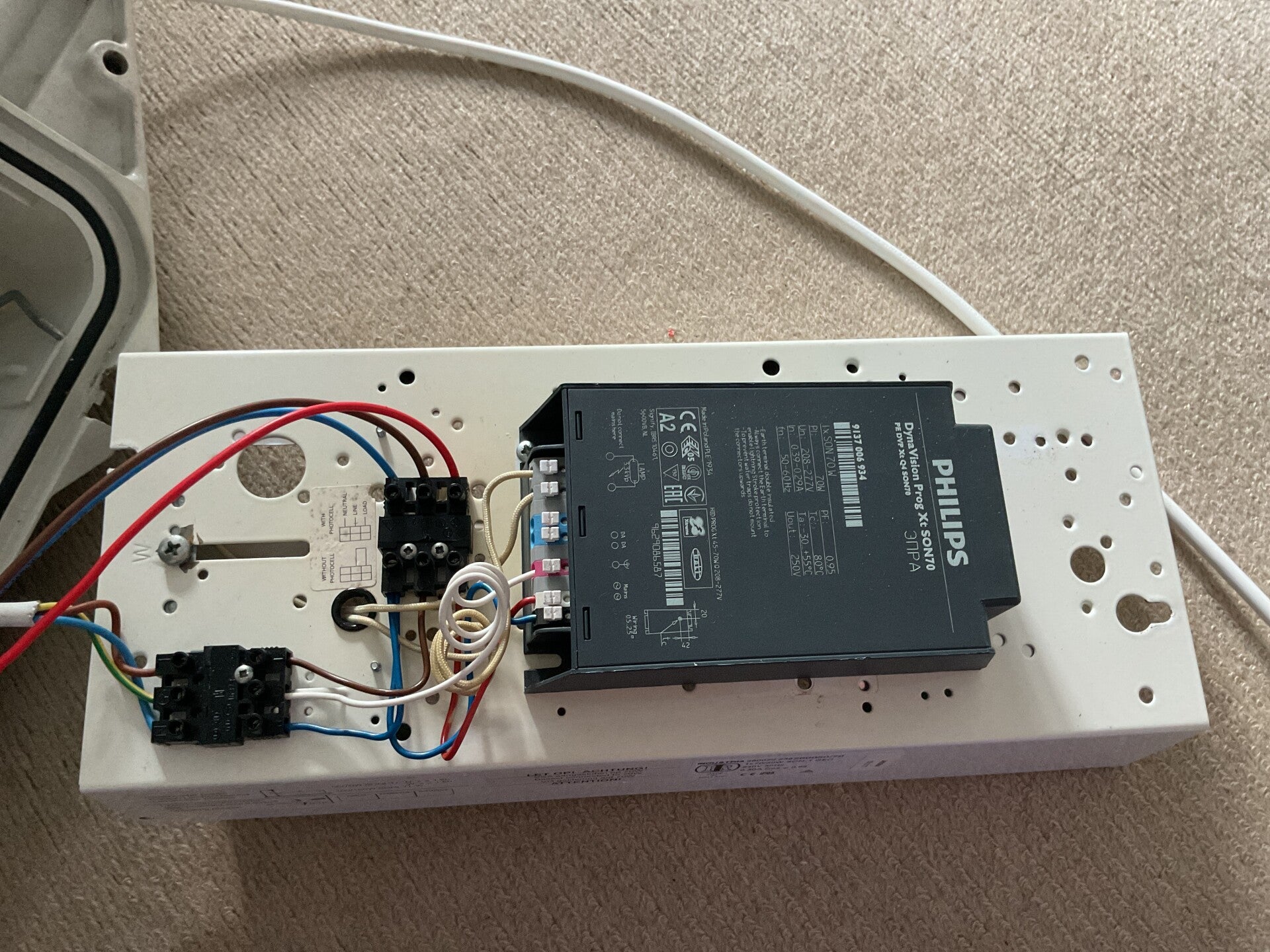 This is my WRTL 2600. The gear isn’t original, as the original gear nearly broke two lamps, one Edison 70w SON-E lamp and one osram 70w SON-T lamp, but it did work with Philips lamps. Luckily, it didn’t break any of the lamps, but it nearly broke them. I did replace the original gear with a 70w SON electronic ballast, however I’ve now installed some new magnetic gear. I also replaced the original 2-part photocell with a mini-cell when I got the lantern, but I’ve now replaced the mini-cell with another 2-part photocell that’s similar to the original one, it’s just got a few cracks on it. The original 2-part photocell is on another lantern. To see the old pictures of what this lantern was like before I changed the gear, chick on the link below.