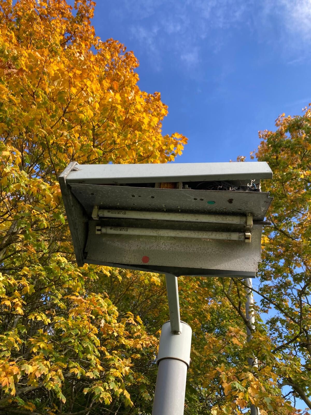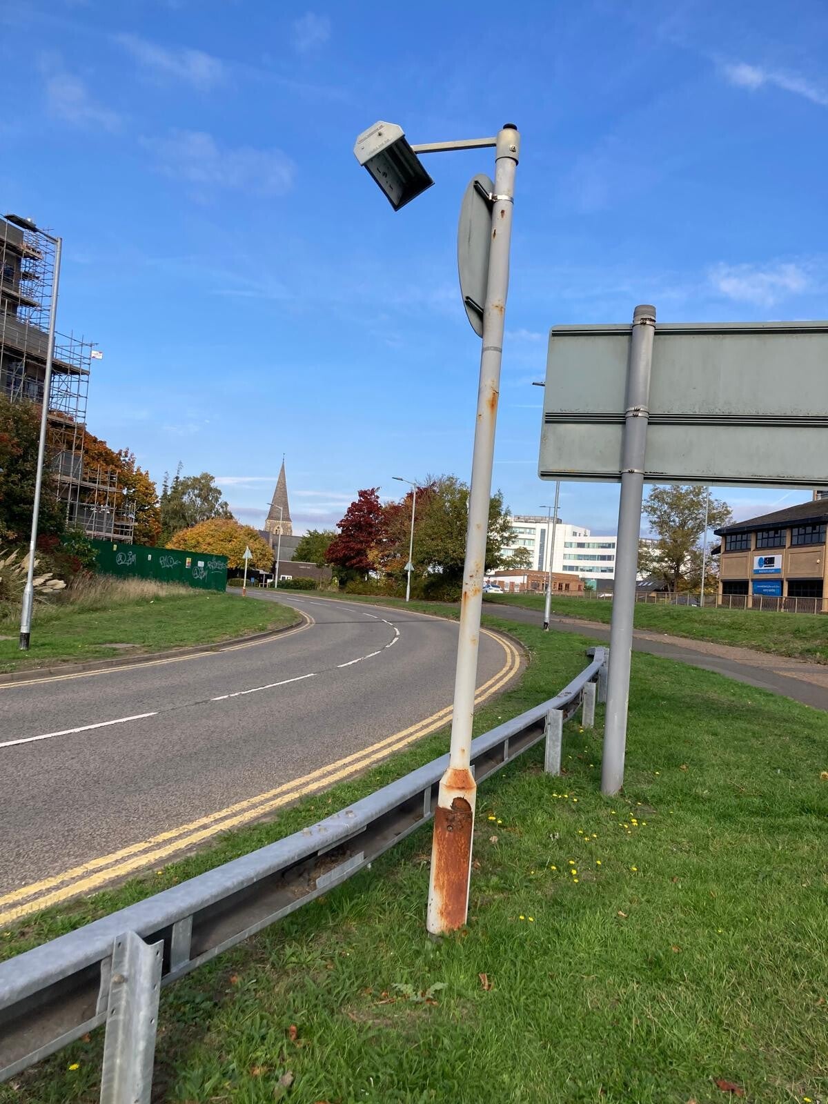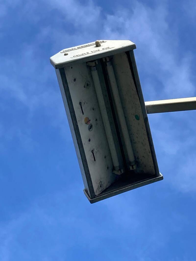 There are a quite a few triplex sign lights in Bracknell, Berkshire. The first one is in good condition, apart from it missing its glass, and the rusted column. It even has a Royce Thompson 2-part photocell on the top of the bracket!
